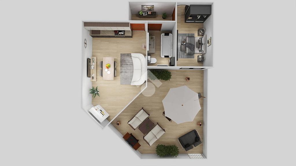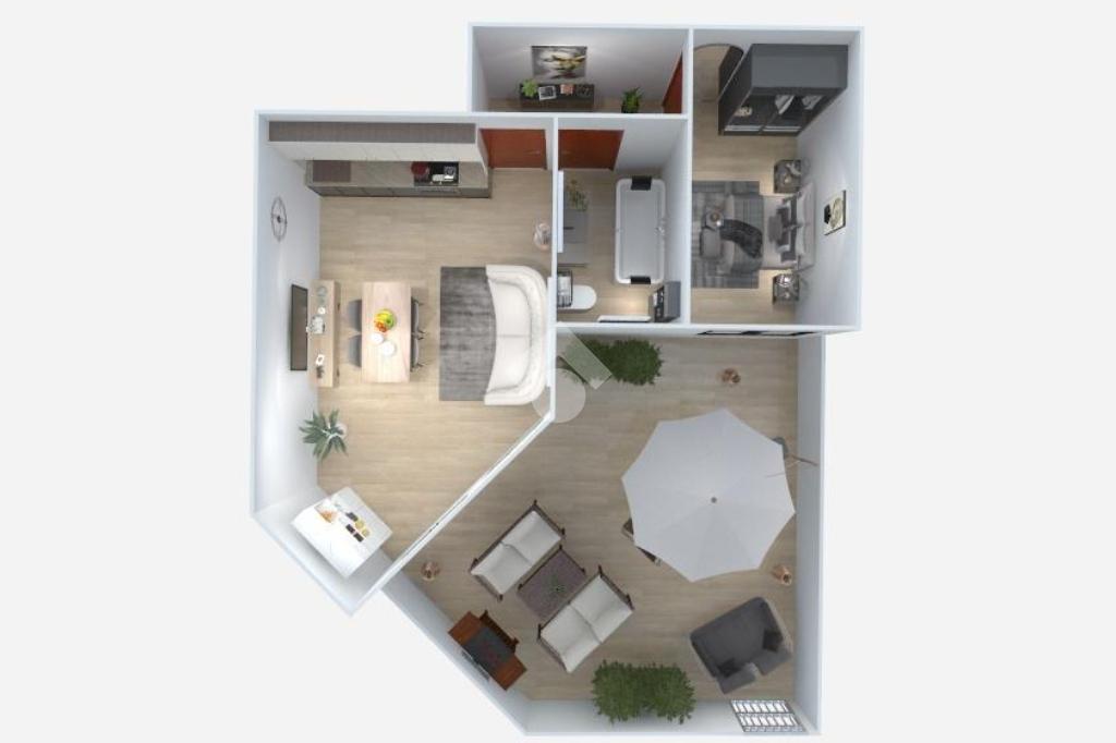 L'immobile ha l'ingresso indipendente ed è composto da sala con angolo cottura, una camera ed una bagno. Arredato. Dispone inoltre di un ampissimo terrazzo ad uso esclusivo. Possibilita di parcheggio.